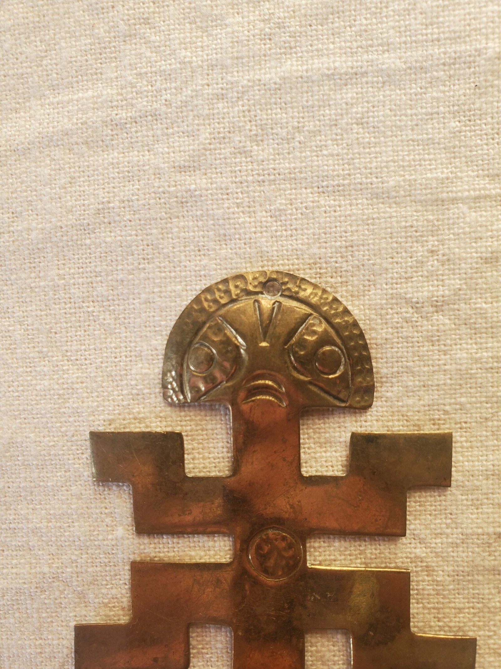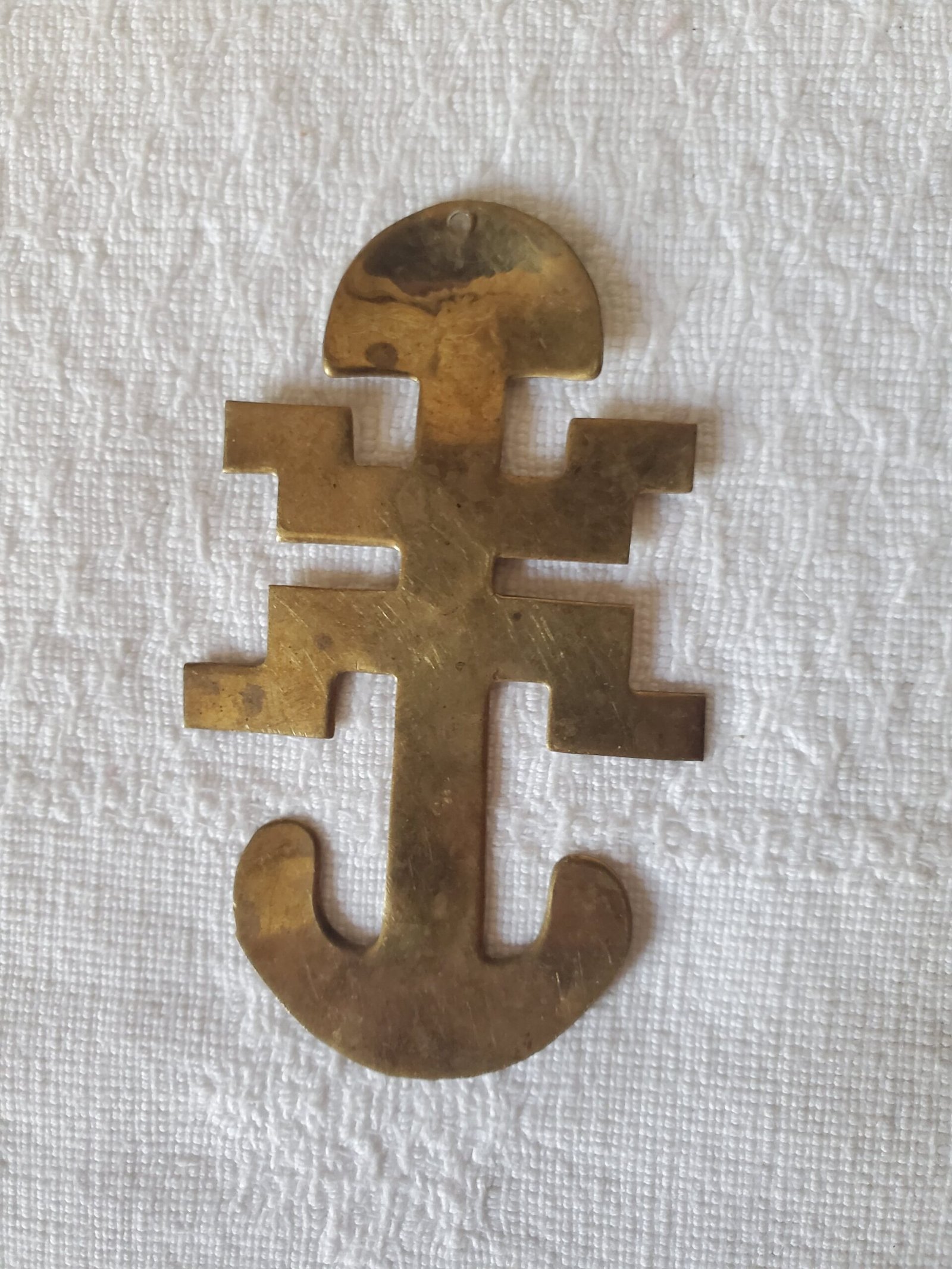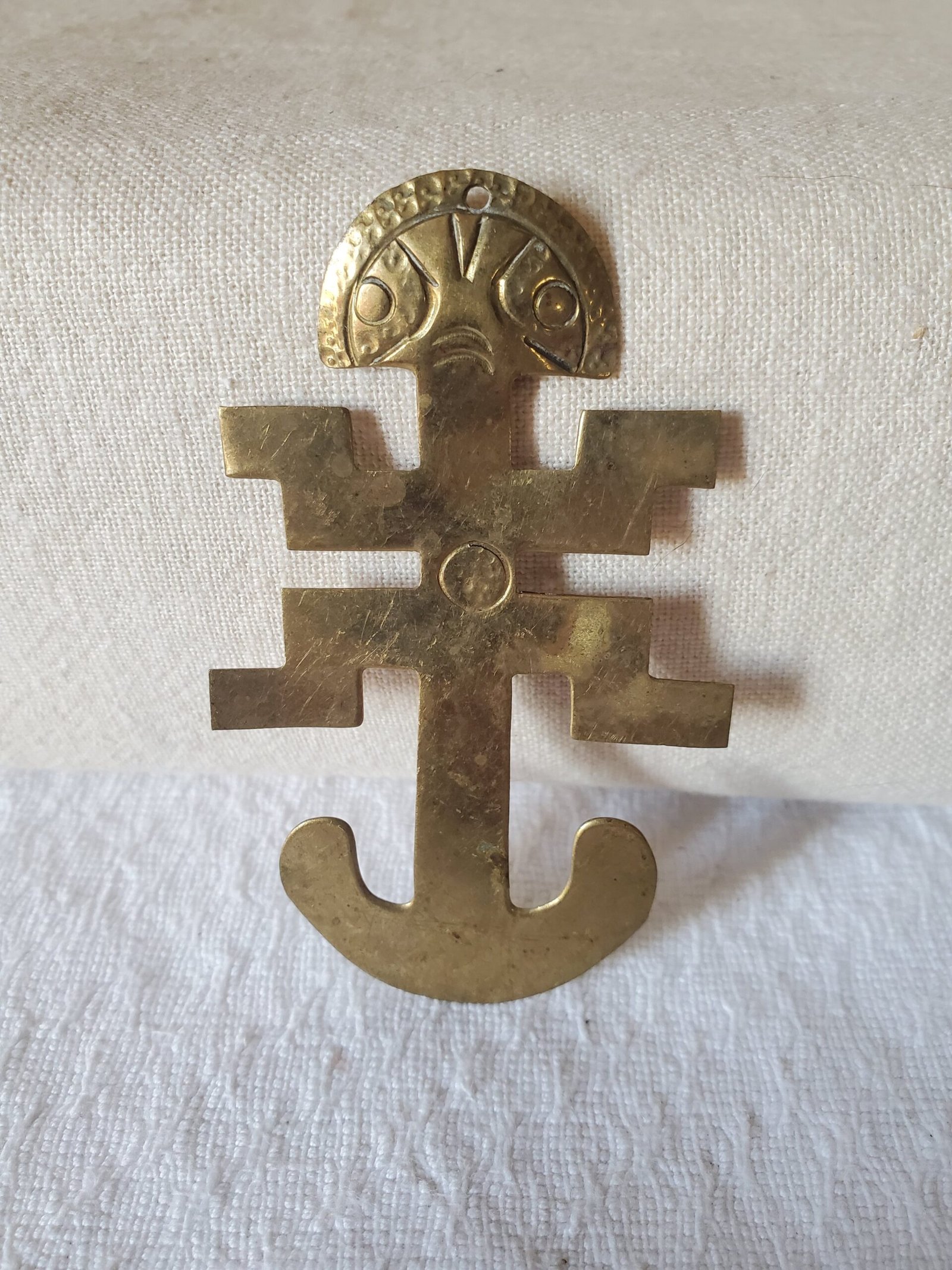 Ce petit totem artisanal en forme de figure humaine stylisée est directement inspiré de l’art précolombien. Riche en symbolisme, il évoque les divinités, ancêtres ou esprits vénérés dans les civilisations anciennes d’Amérique du Sud. Sa finitions dorée lui confère un aspect sacré et précieux, renforçant son aura mystique.